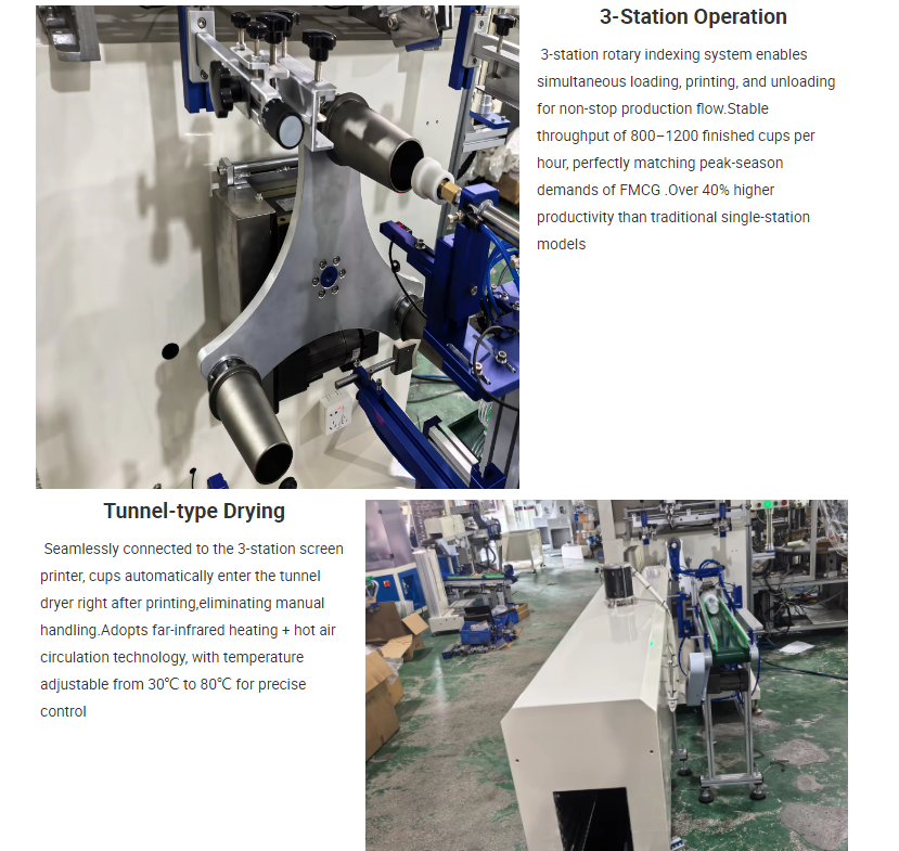 * The integrated 3-station printing + tunnel drying workflow ensures consistent print quality across thousands of cups,supporting peak-season demand for new product launches or promotional campaigns.